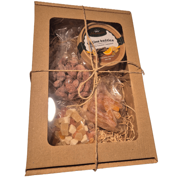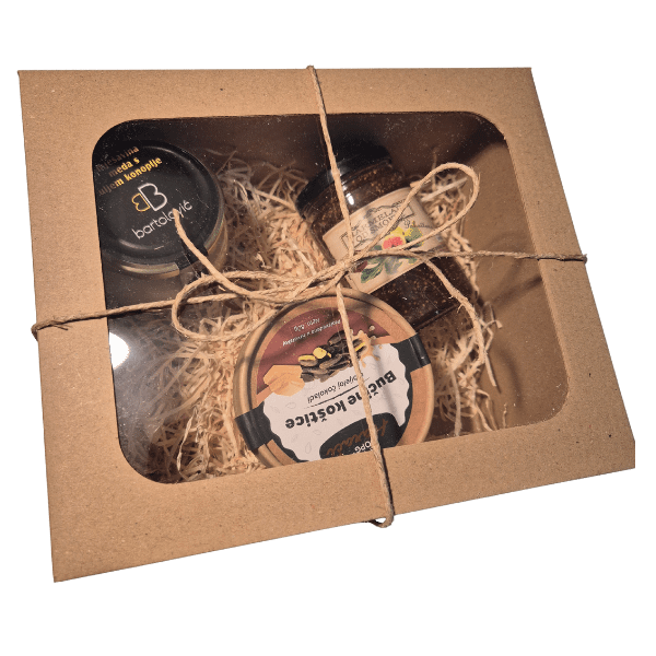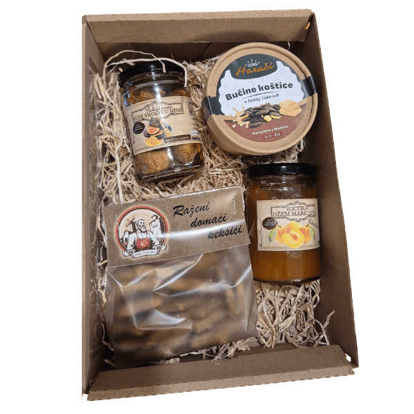 Svaki proizvod donosi dašak domaće tradicije. Slatke smokve u medu i aromatični džem marelice unose prirodnu raskoš, dok keksići i bučine koštice obogaćene čokoladom dodaju hrskavu, razigranu notu. Paket je idealan poklon za prijatelje, obitelj ili poslovne partnere.