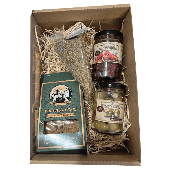 Svaki proizvod u paketu odražava autentičnost i kvalitetu domaćih delicija. Suhe rajčice i masline ističu bogatstvo okusa, dok pirovi krekeri i začini savršeno nadopunjuju svaki zalogaj, stvarajući uravnoteženu i aromatičnu kombinaciju.