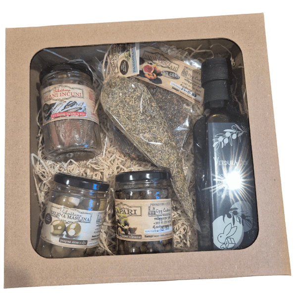 Svaki proizvod u paketu odražava autentičnost i kvalitetu domaćih dalmatinskih delicija. Masline, inćuni i kapari unose slanost Jadrana, dok maslinovo ulje i začini ističu aromu mediteranskih jela. Smokvenjak dodaje prirodnu slatkoću i balansira okuse, čineći paket idealnim poklonom.