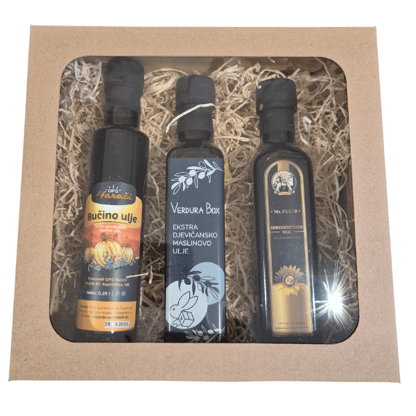 Poklon paket Ulja Hrvatske spaja najbolje domaće ulja koja predstavljaju raznolikost hrvatskih regija. Paket sadrži ekstra djevičansko maslinovo ulje iz Dalmacije (200 ml), hladno prešano 100% bučino ulje iz Podravine (200 ml) i hladno prešano 100% suncokretovo ulje iz Moslavine (200 ml) – svaki proizvod pažljivo odabran da donese autentičan okus i kvalitetu.