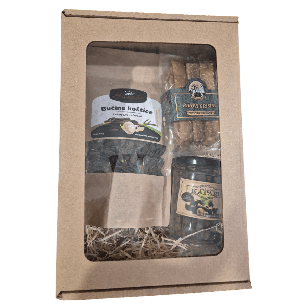 Hrskavi grisini i začinjene bučine koštice idealni su za posipanje po salatama, juhama ili toplim jelima, dok kapari unose karakterističnu mediteransku notu. Paket je pažljivo odabran kako bi inspirirao kreativnost u kuhinji i omogućio jednostavno podizanje svakog obroka na novu razinu.